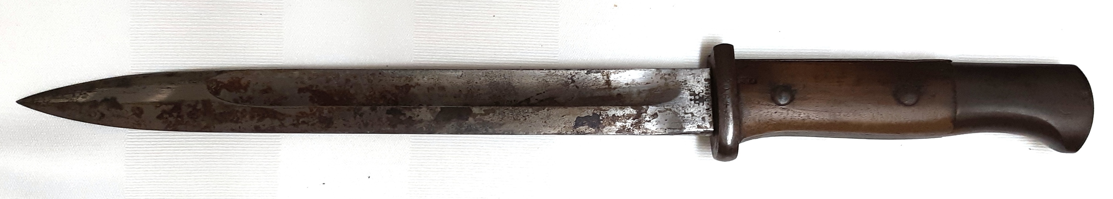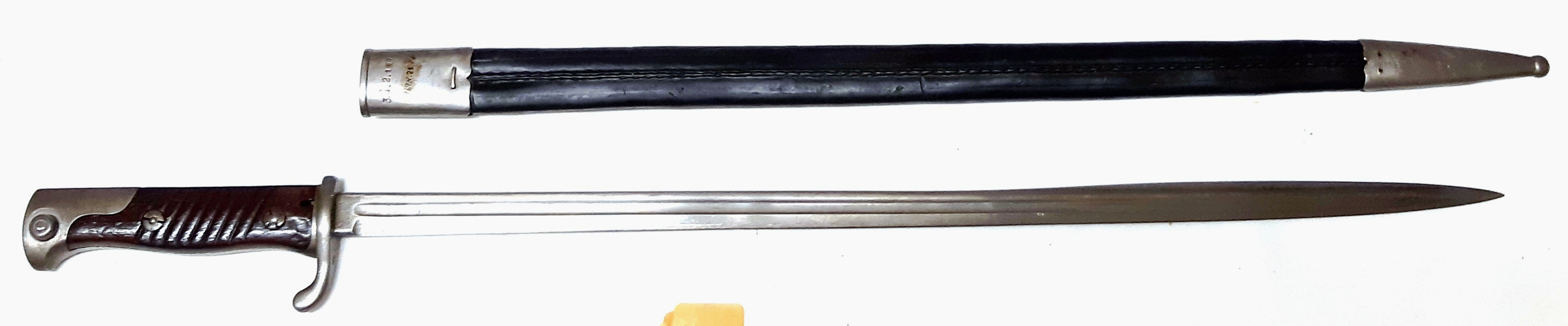 Bayonet (1969.N.25.1).   German Gew 98 M1898 Mauser Bayonet and scabbard. This Model 1898 has a rib back blade design, and is 25.75-inchesin length with a 20.5-inch blade.  It hasa two-piece hardwood grip and has the scabbard intact.