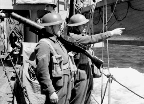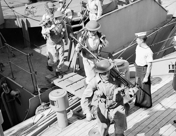 Soldiers of the 1st Battalion The Black Watch (RHR) of Canada, with a Lewis gun on board HMCS Ottawa, near Botwood, Newfoundland, 22 June 1940.