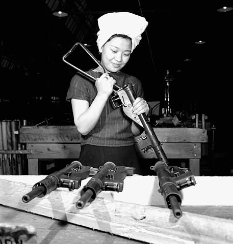 Agnes Wong of Whitecourt, Alberta, assembles a Sten gun produced for China at the Long Branch, Ontario, Small Arms Ltd. plant, April 1944. Sten guns were a family of British-made machine guns that saw widespread use in the Second World War. The Sten is a blowback-operated submachine gun that became incredibly popular thanks to its simple, cheaply-made design. At first, it was used by insurgency groups throughout Europe. By the end of the war, however, it became the second-most produced submachine gun used by Allied troops around the world.