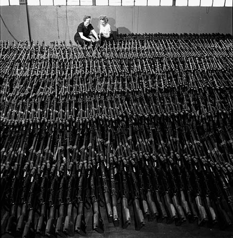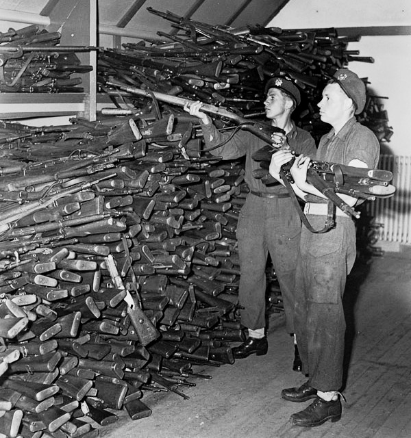 German rifles surrendered to Canadians being stacked for storage, Ijmuiden, Netherlands, 11 May 1945.