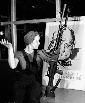 Veronica (Ronnie) Foster, employee of the John Inglis Co. and known as “The Bren Gun Girl”, poses with a finished Bren gun in front of a poster of Winston Churchill at the John Inglis Co. Bren gun plant, 10 May 1941.