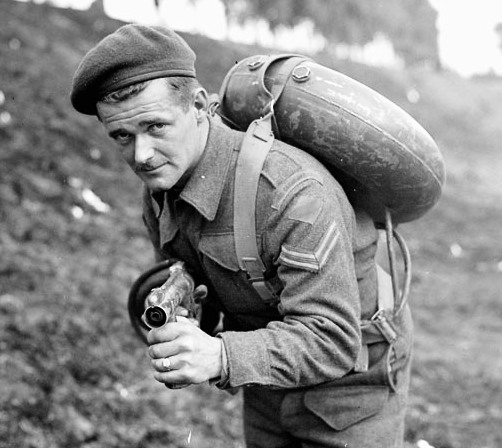Lifebuoy Flamethrower, Balgerhoek, Belgium, 4 Oct 1944. The NBMHM would like to acquire one of these for its collection.