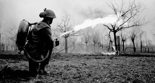 A Lifebuoy flamethrower, Xanten, Germany, 10 Mar 1945.