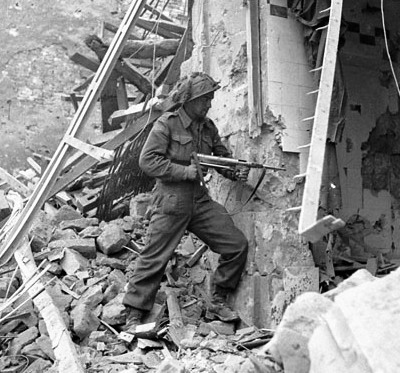 Stormont, Dundas and Glengarry Highlander soldier armed with a German 9-mm MP 40 submachine-gun storming a building in Caen, France, 10 Jul 1944.