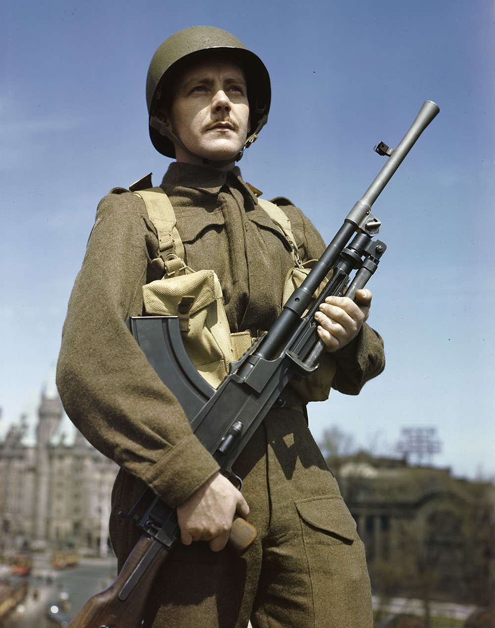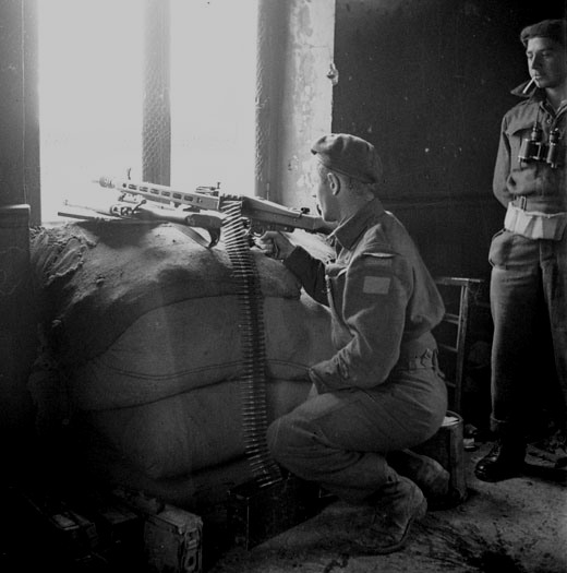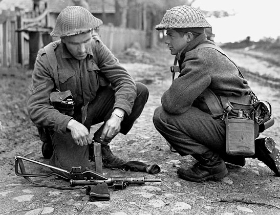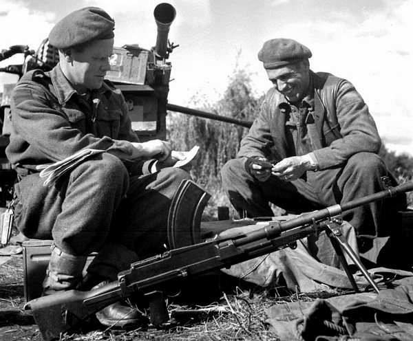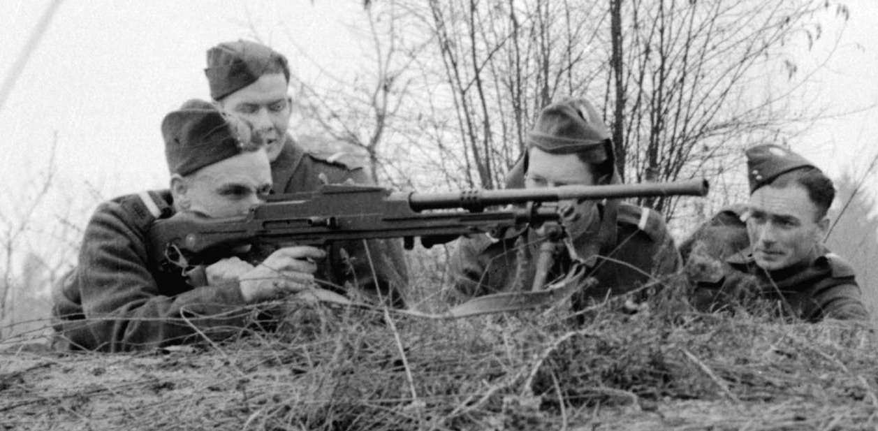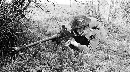 Canadian soldier firing a Bren Gun.