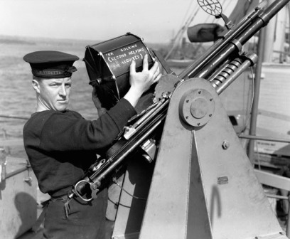 Royal Canadian Navy, naval rating loading an ammunition drum onto a Hispano 20-mm anti-aircraft gun aboard a warship, Halifax, Nova Scotia, May 1941.