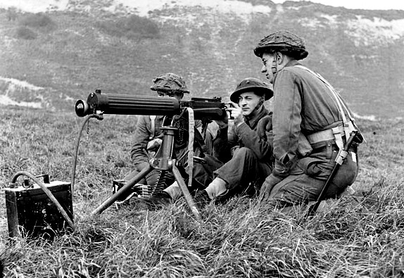 Vickers machine gun or Vickers gun, a water-cooled .303-inch British machine gun produced by Vickers Limited, originally for the British Army.  The machine gun typically required a six to eight-man team to operate: one fired, one fed the ammunition, the rest helped to carry the weapon, its ammunition and spare parts.  It was in service from before the First World War until the 1960s, with air-cooled versions of it on many Allied First World War fighter aircraft.