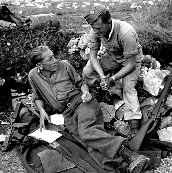 Private Danny Dafoe with a Thompson SMG by his side and Lance-Corporal L.H. MacWilliam, both of Princess Patricia’s Canadian Light Infantry, in a slit trench, Spinete, Italy, ca. 22-23 October 1943.