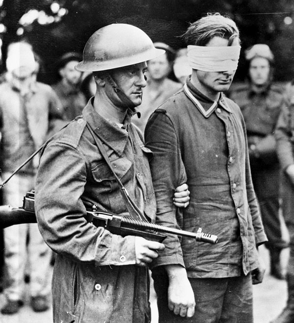 Canadian soldier with Thompson SMG and German PW captured during the Dieppe raid, 19 Aug 1942.