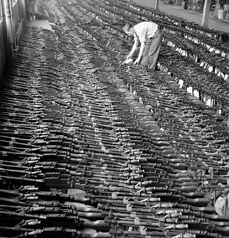 Finished Bren gun sitting on a table top at the John Inglis Co. Bren gun plant, 10 May 1941. The Bren featured a 30-round magazine. It saw a variety of uses during the Second World War, including use as an anti-aircraft gun, and remains a potent symbol thanks to its unique top-side magazine. While the British produced the Sten, it was designed by Václav Holek and named after Brno, a Czech facility, and the location of the British Royal Small Arms Factory in Enfield, United Kingdom.