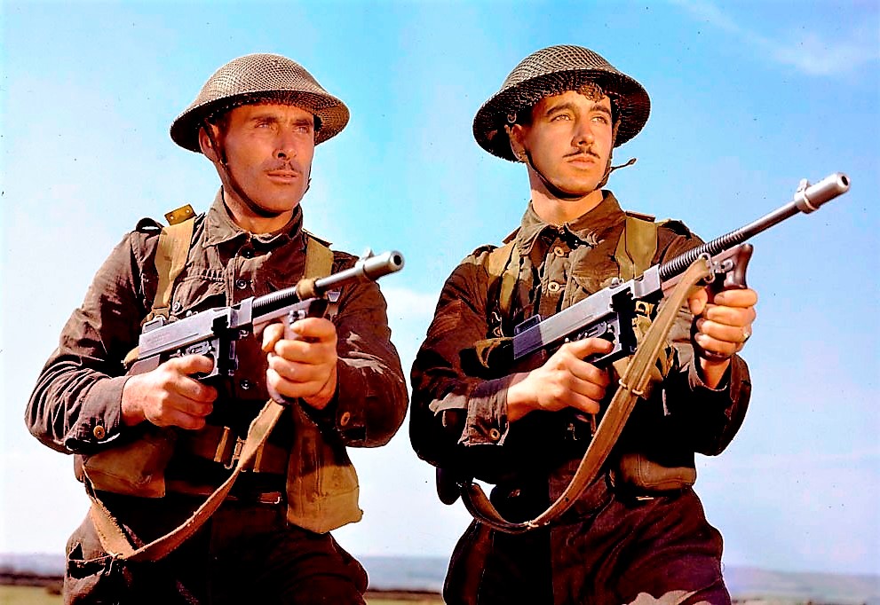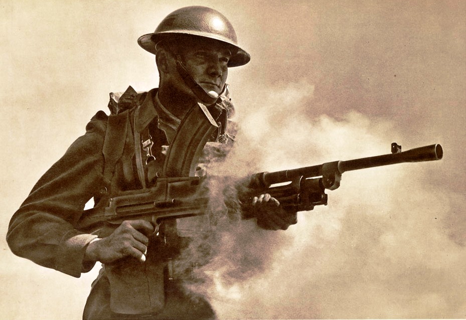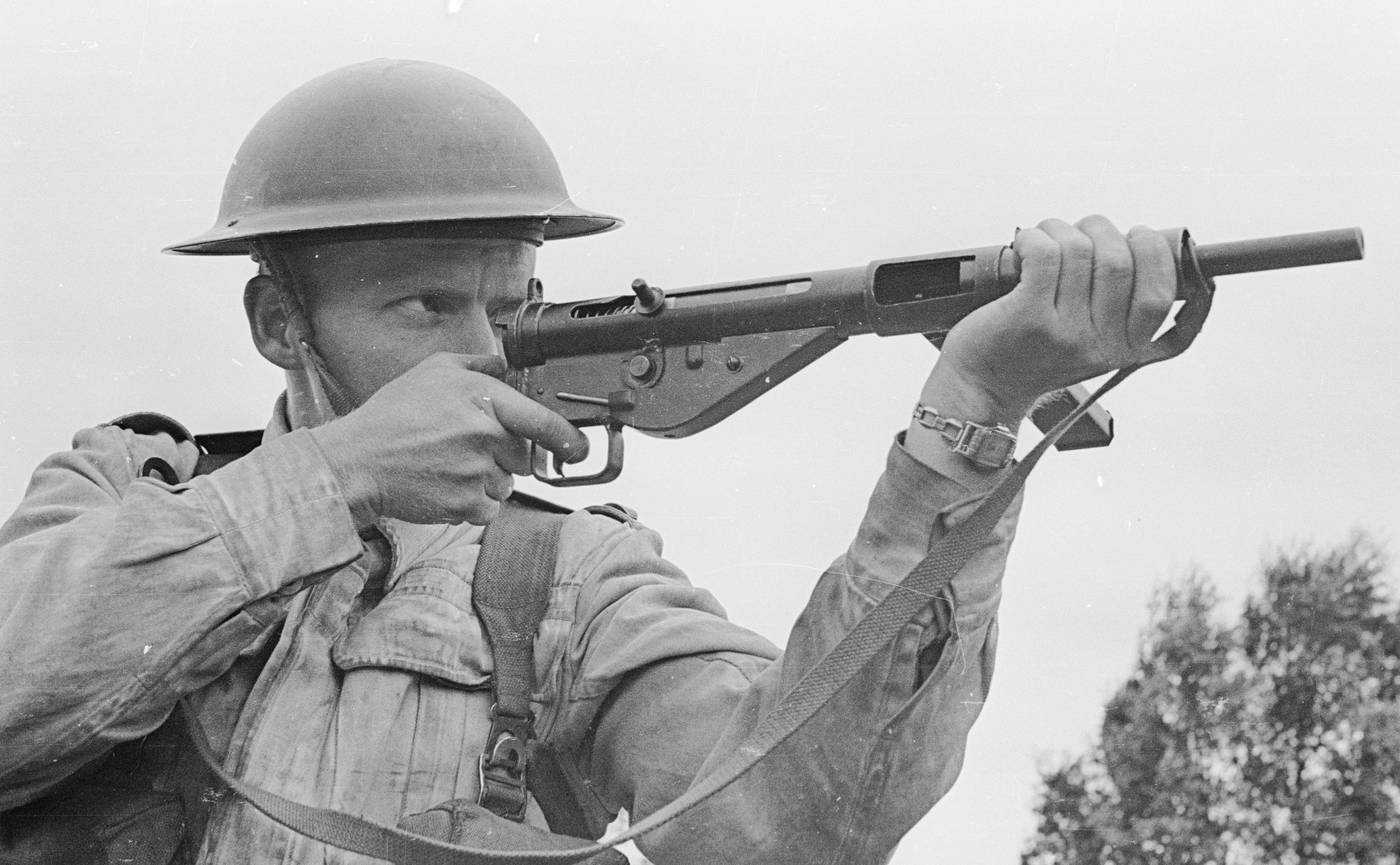 Soldier firing a Sten gun.