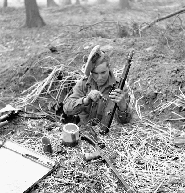 Private J.E. LeBlanc, Queen’s Own Cameron Highlanders of Canada, cleaning his Bren gun in a foxhole in the Hochwald, Germany, 5 March 1945,
