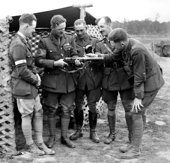 Canadian soldiers examining a captured German 9-mm MP 18 Bergmann SMG, Amiens, France, Aug 1918.