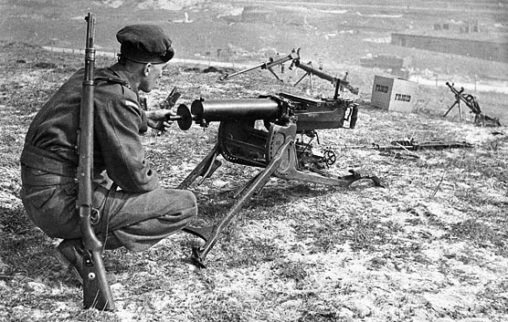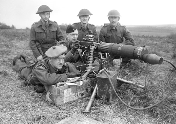 A Vickers .303 machine-gun manned by PPCLI soldiers training in England, 3 Dec 1942.