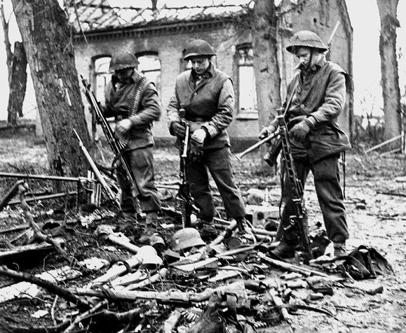 Soldiers with the Regina Rifles examining German weapons, Zyfflich, Germany, 9 Feb 1945.