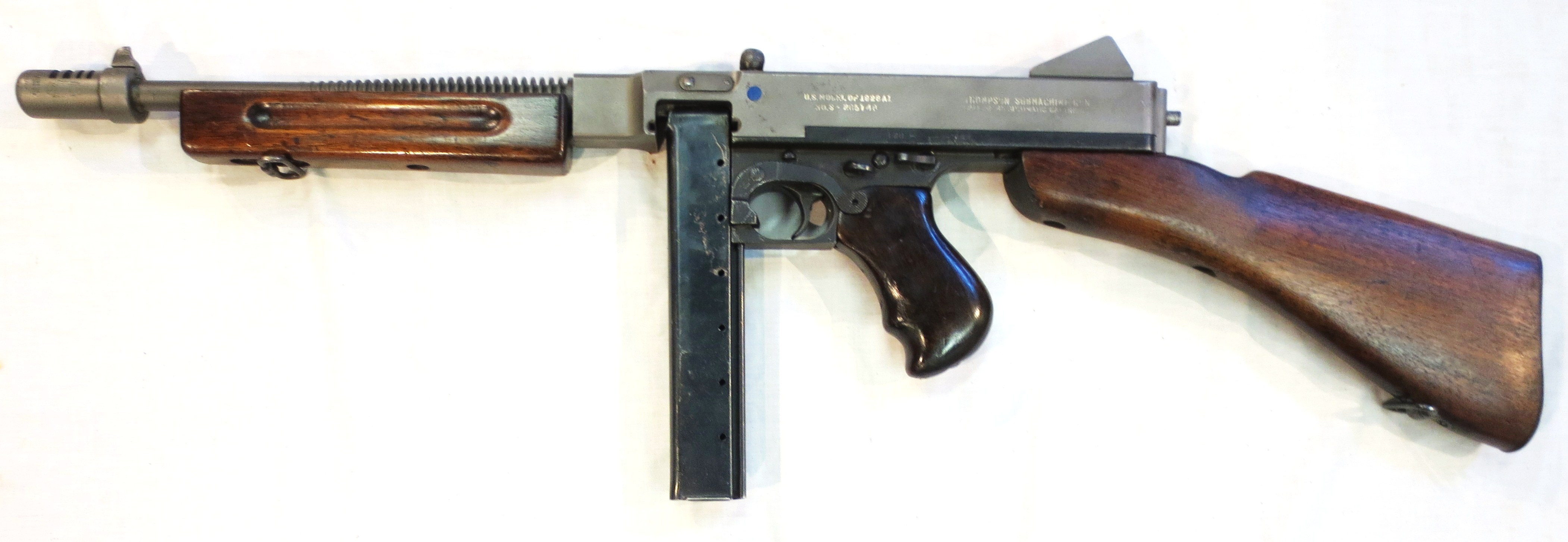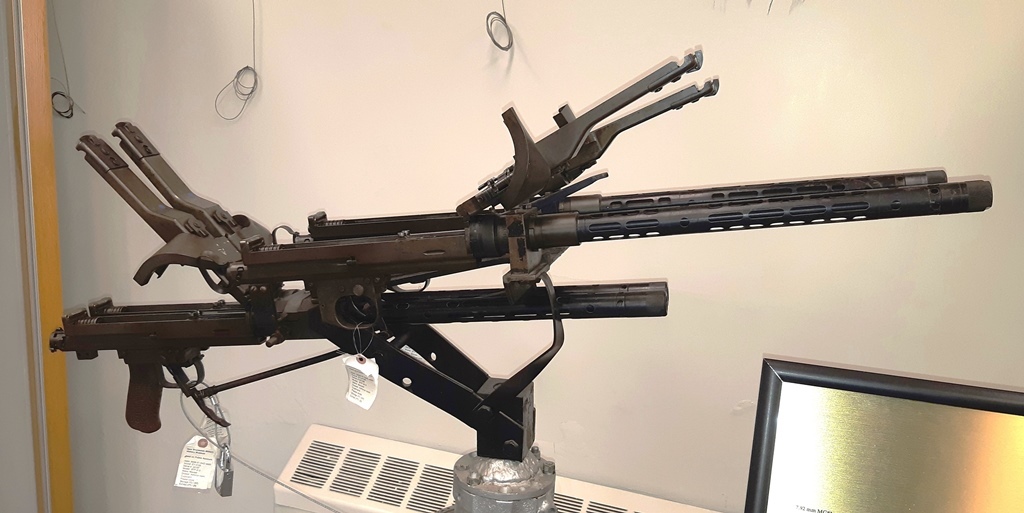 Paul M. Ripley, a private collector has shown members of the museum his collection of four Thompson SMGs. One of these Thompson SMGs is stamped with the Royal Arrowhead. These Thompsons were destined for the UK, but apparently a few were sent to Canada for use by the Veteran’s Guard, guarding Prisoners of War (PW) in Canada.  The same collector also had a Thompson chambered to fire 9-mm rounds so captured German ammunition could be used.
