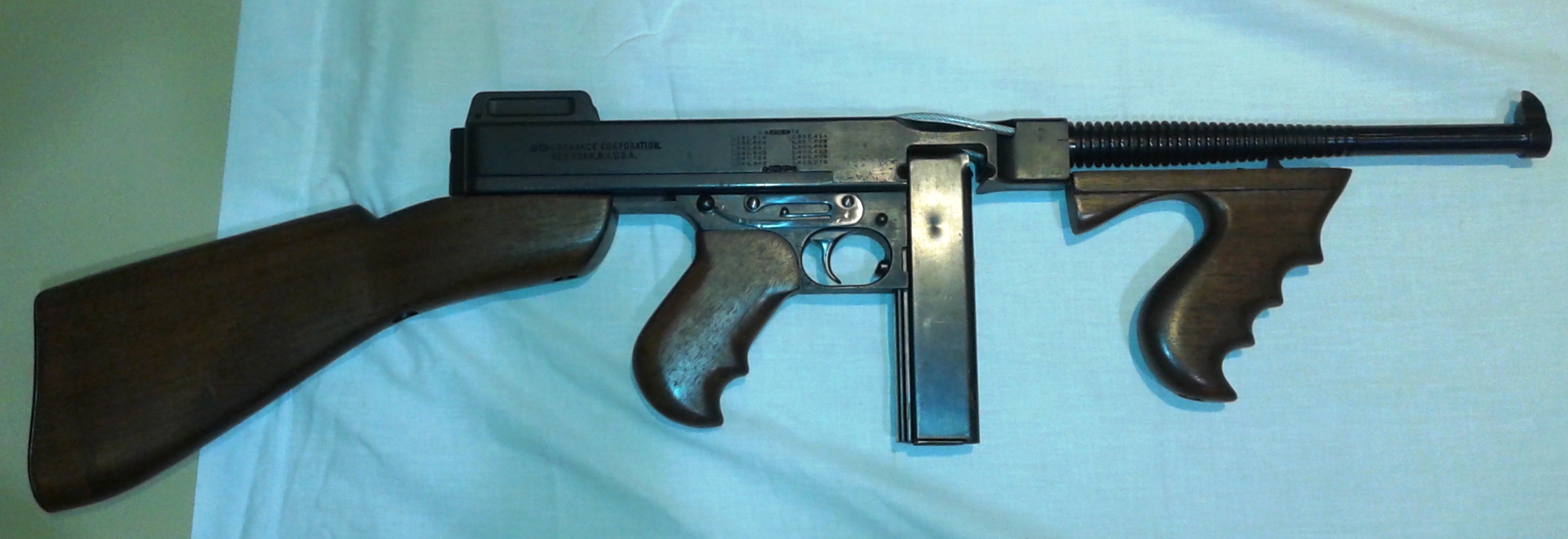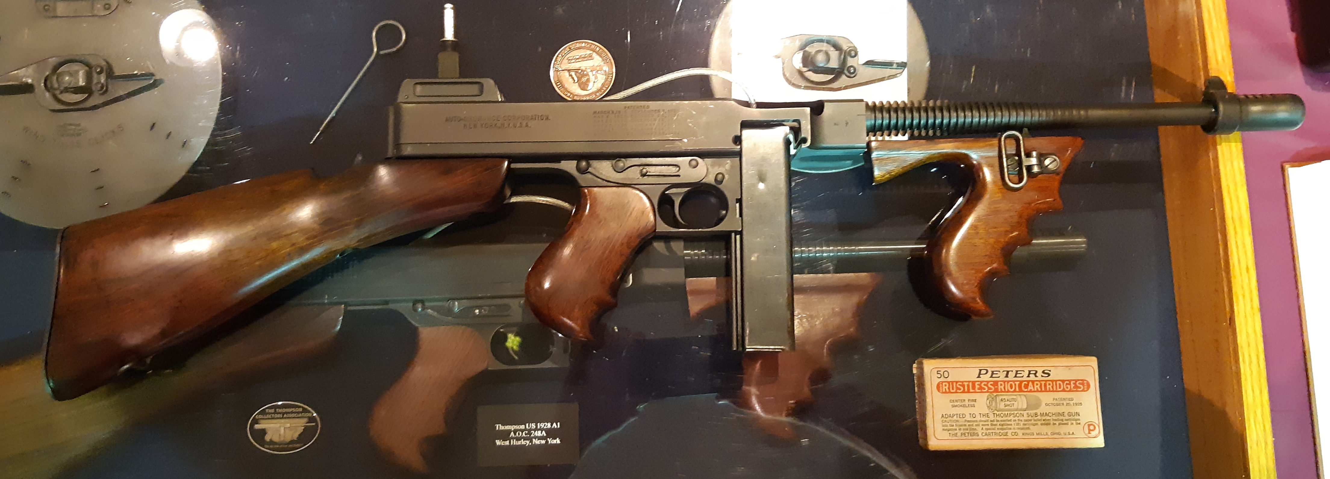 Thompson submachine-gun, two versions in the museum.  The Thompson is an American .45 calibre submachine gun, invented by John T. Thompson in 1918.  The Thompson had excellent ergonomics, compactness, fired a large .45 ACP cartridge, had reliability and high volume of automatic fire. While it weighed just under 5 kilograms it could handle 50 or 100 round drum magazines. Over one million were produced during the Second World War.