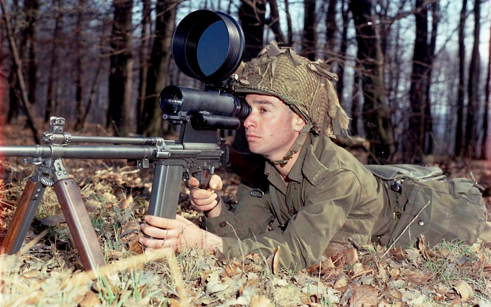 Royal Canadian Dragoons Reconnaissance Squadron Trooper on UN Duty with 7.62-mm FN C1 Rifle, observing the Turkish North side from Mount St Hilarion, Cyprus.