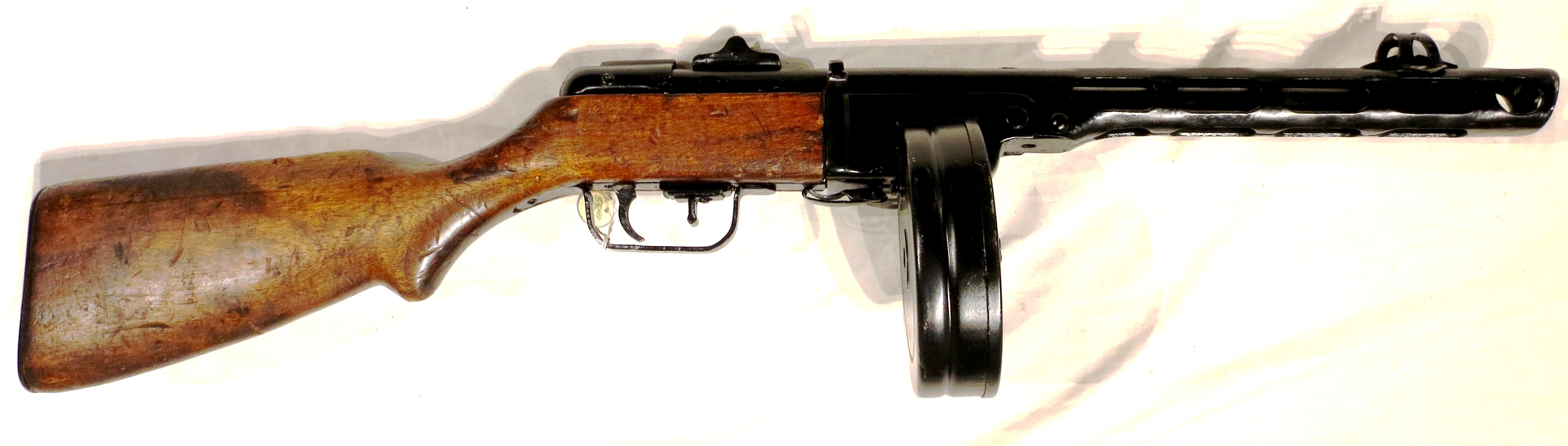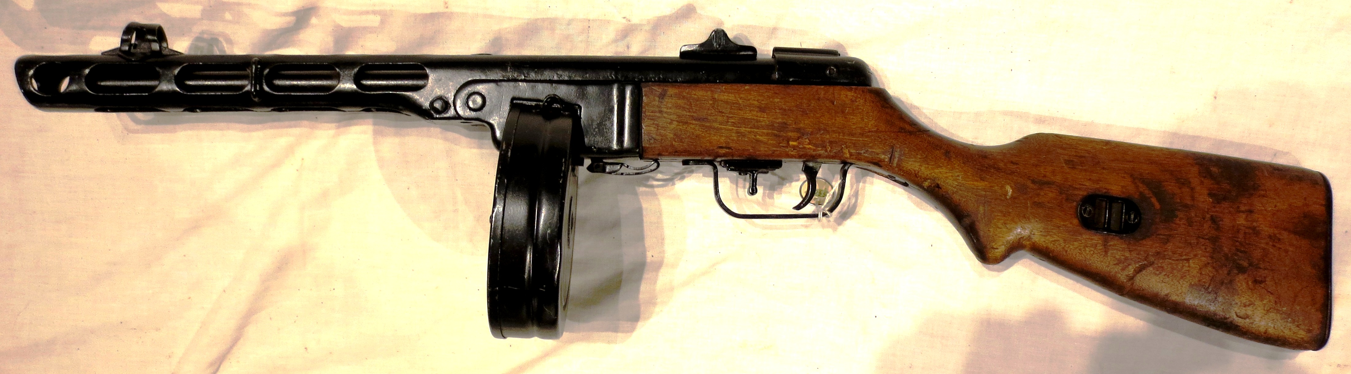 The PPSh-41 fires the standard Soviet pistol and submachine gun cartridge, the 7.62×25mm Tokarev. Weighing approximately 12 pounds (5.45 kg) with a loaded 71-round drum and 9.5 pounds (4.32 kg) with a loaded 35-round box magazine. The PPSh is capable of a rate of about 1250 rounds per minute, a very high rate of fire in comparison to most other military submachine guns of the Second World War. It is a durable, low-maintenance weapon made of low-cost, easily obtained components, primarily stamped sheet metal and wood. The final production PPShs have top ejection and an L type rear sight that can be adjusted for ranges of 100 and 200 meters. A crude compensator is built into the barrel jacket, intended to reduce muzzle climb during automatic fire. The compensator was moderately successful in this respect, but it greatly increased the muzzle flash and report of the weapon. The PPSh also has a hinged receiver to facilitate field-stripping and cleaning the weapon.A chrome-lined bore enables the PPSh to withstand both corrosive ammunition and long intervals between cleaning. No forward grip or forearm was provided, and the operator generally has to grasp the weapon behind the drum magazine with the supporting hand, or else hold the lower edge of the drum magazine. Though 35-round curved box magazines were available from 1942, the average Soviet infantryman in the Second World War carried the PPSh with the original 71-round drum magazine.Although the PPSh drum magazine holds 71 rounds, misfeeding is likely to occur with more than about 65. In addition to feed issues, the drum magazine is slower and more complicated to load with ammunition than the later 35-round box magazine that increasingly supplemented the drum after 1942. While holding fewer rounds, the box magazine does have the advantage of providing a superior hold for the supporting hand. Although the PPSh is equipped with a sliding bolt safety, the weapon’s open-bolt design still presents a risk of accidental discharge if the gun is dropped on a hard surface. (Wikipedia)