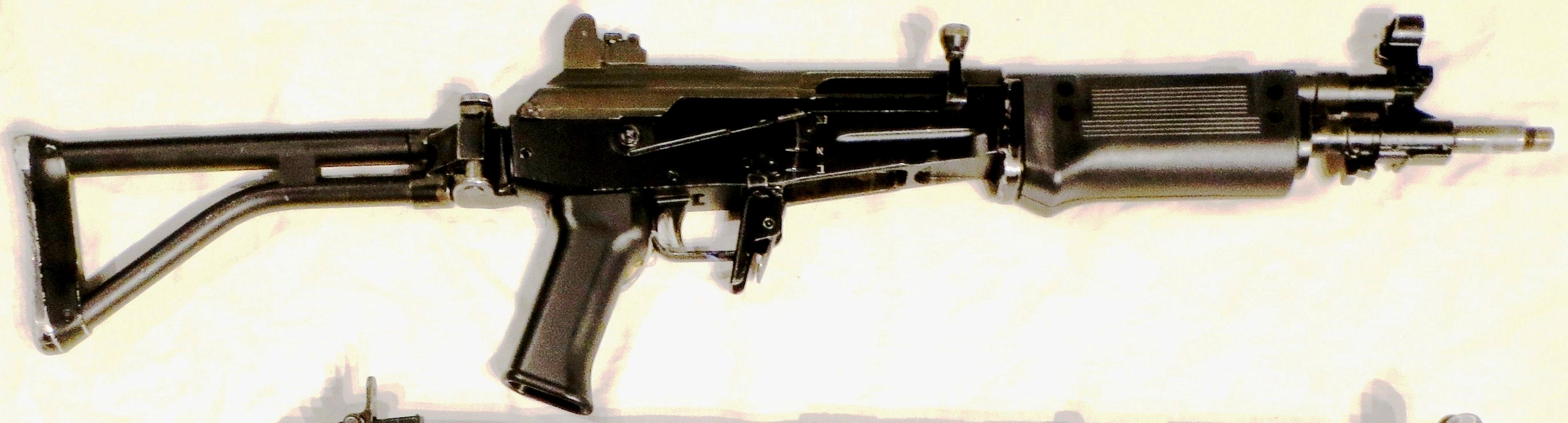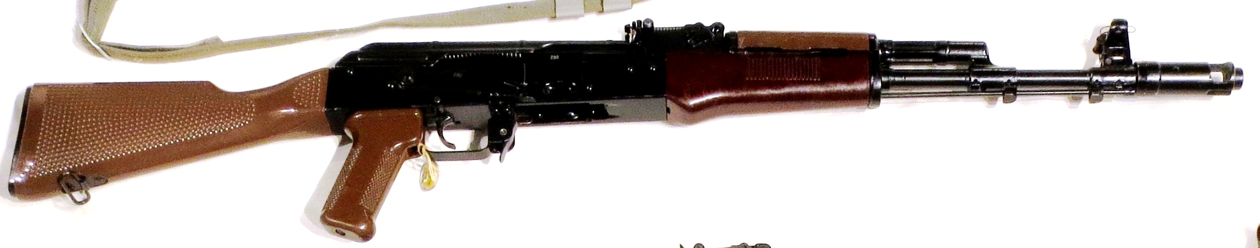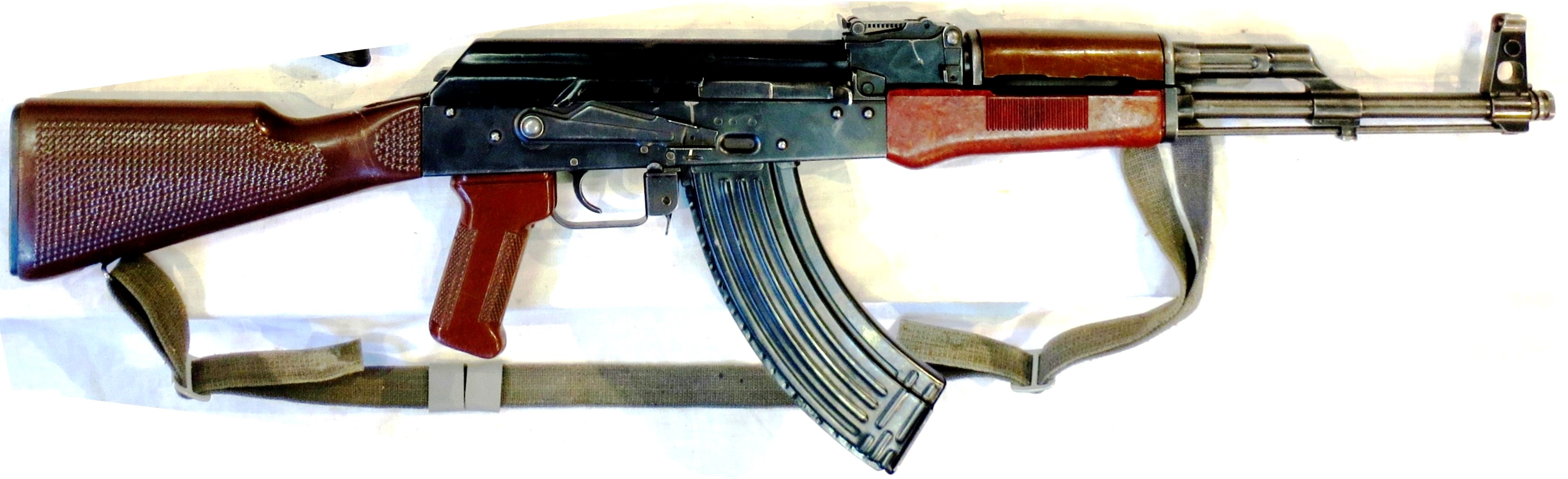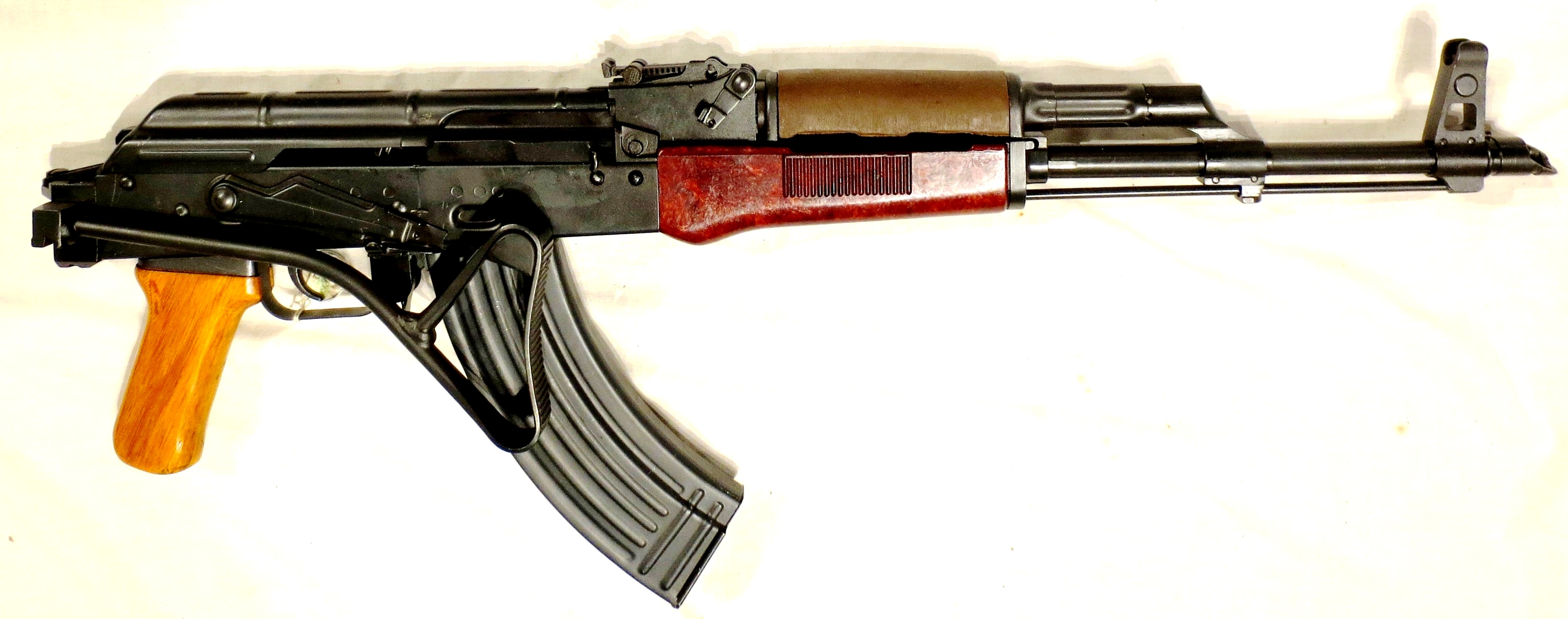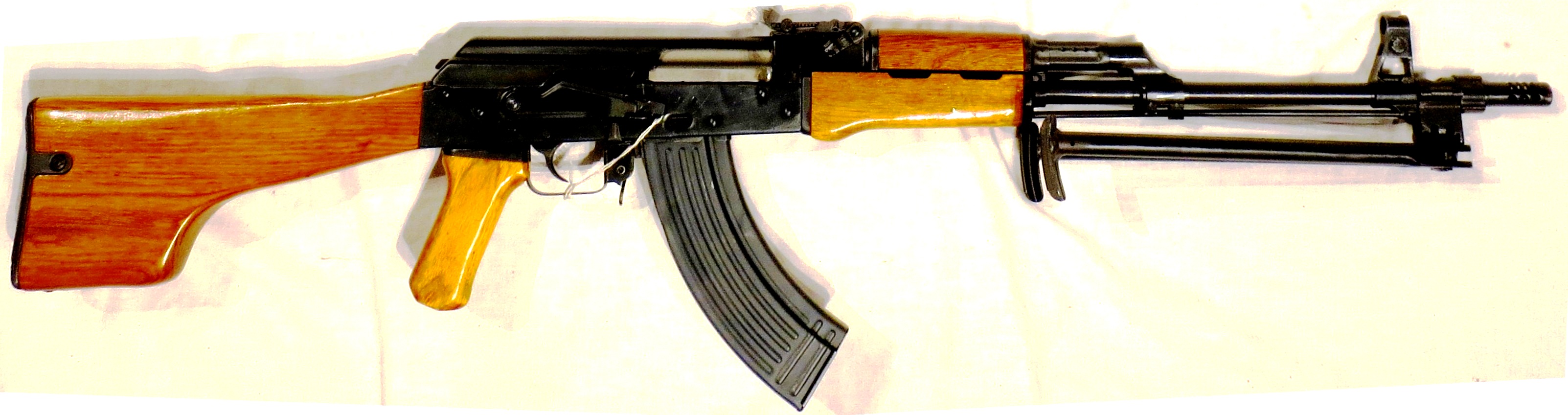 The RPK (Ручной пулемёт Калашникова/РПК), Kalashnikov’s hand-held machine gun”), sometimes inaccurately termed the RPK-47, is a Soviet 7.62×39mm light machine gun that was developed by Mikhail Kalashnikov in the early 1960s, in parallel with the AKM assault rifle. It was created to standardize the small arms inventory of the Soviet Army, where it replaced the 7.62×39mm RPD machine gun. The RPK continues to be used by the military of the post-Soviet states and several African and Asian nations. The RPK is also manufactured in Bulgaria, Hungary, Romania, and Serbia. The RPK functions identically to the AK-47. It also uses the same 7.62×39mm ammunition. It has a similar design layout to the Kalashnikov series of rifles, with modifications to increase the RPK’s effective range and accuracy, enhance its sustained fire capability, and strengthen the receiver. The RPK features a thicker and longer barrel than the AKM. This allows for it to be fired for longer without permanent loss in accuracy due to the barrel heating up. The chrome-lined barrel is permanently fixed to the receiver and cannot be replaced in the field. It is fitted with a new front sight base, and the gas block lacks both a bayonet lug and an under-barrel cleaning rod guide. The barrel also features a folding bipod mounted near the muzzle, and a front sight base with a lug that limits the bipod’s rotation around the axis of the barrel. The barrel has a threaded muzzle, enabling the use of muzzle devices such as flash hiders, compensators, and blank-firing adapters. When a muzzle device is not being used, the threads on the muzzle can be covered by a thread protector. The barrel is pinned to the receiver in a modified trunnion, reinforced by ribbing, and is slightly wider than the trunnion used on the standard AKM type rifles. Symmetrical bulges on both sides of the front trunnion ensure a proper fit inside the receiver.The U-shaped receiver is stamped from a smooth 1.5 mm (0.06 in) sheet of steel compared to the 1.0 mm (0.04 in) sheet metal receiver used on the standard AKM rifles. It uses a modified AKM recoil spring assembly that consists of a rear spring guide rod from the AK and a new forward flat guide rod and coil spring. It features a thick laminated wood foregrip and a fixed laminated wood “club-foot” buttstock similar to the stock used on the RPD, which is designed to allow the user to fire from the prone position more comfortably.[6] It uses a standard AKM pistol grip and can also use standard AKM detachable box magazines, but it is most commonly used with a 40-round box magazine or a 75-round drum magazine. Interchangeability of parts between the RPK and AKM are moderate. (Wikipedia)