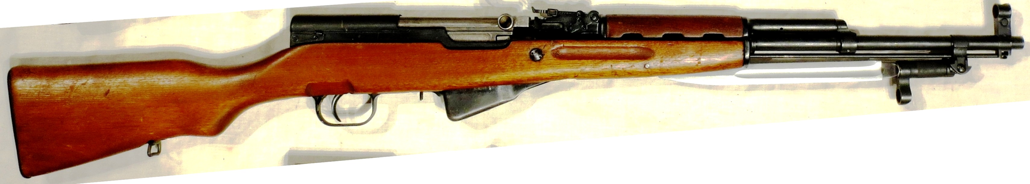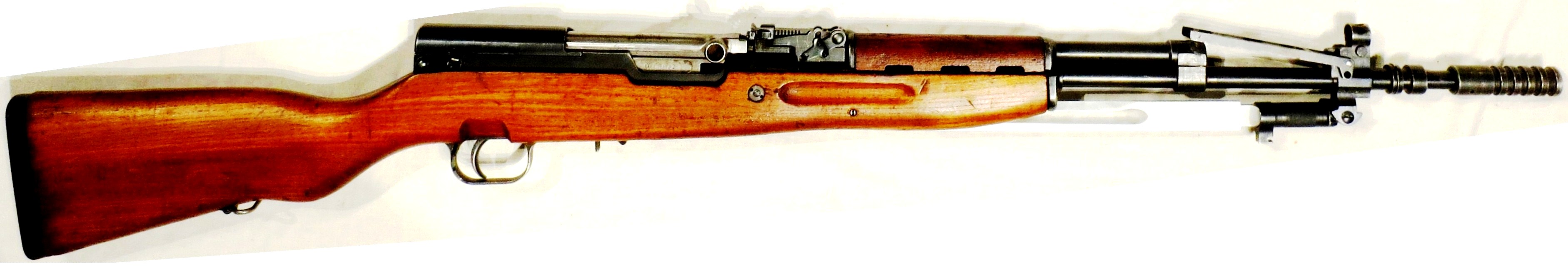 China, 7.62-mm Norinco Type 56, SKSD Rifle with folding bayonet. The SKS (Самозарядный карабин системы Симонова) (self-loading carbine of the Simonov system’) is a semi-automatic rifle designed by Soviet small arms designer Sergei Gavrilovich Simonov in the 1940s.The SKS was first produced in the Soviet Union but was later widely exported and manufactured by various nations. Its distinguishing characteristics include a permanently attached folding bayonet and a hinged, fixed magazine. As the SKS lacked select-fire capability and its magazine was limited to ten rounds, it was rendered obsolete in the Soviet Armed Forces by the introduction of the AK-47 in the 1950s. Nevertheless, SKS carbines continued to see service with the Soviet Border Troops and second-line and reserve army units for decades.The SKS was manufactured at Tula Arsenal from 1949 to 1958, and at the Izhevsk Arsenal from 1953 to 1954. Altogether, the Soviet Union produced 2.7 million SKS carbines. Throughout the Cold War, millions of additional SKS carbines and their derivatives were also manufactured under license in the People’s Republic of China, as well as a number of countries allied with the Eastern Bloc. The SKS was exported in vast quantities and found favour with insurgent forces around the world as a light, handy weapon which was adequate for guerrilla warfare despite its conventional limitations.Beginning in 1988, millions have also been sold on the civilian market in North America, where they remain popular as hunting and sporting rifles.After negotiations between Mao Zedong and Soviet premier Nikita Khrushchev, the Soviet Union agreed to transfer the technology for the SKS, as well as the AK-47 and the 7.62×39mm cartridge. Parallel production lines for the SKS and the AK-47 were set up in China the following year. Chinese production of the SKS continued for decades after it ceased in the Soviet Union, and over nine million had been manufactured as the Type 56 carbine in that country by the 1980s. Eighty Chinese factories eventually tooled up to produce the Type 56 carbine, although the primary production line was established at the Jianshe Machine Tool Factory, officially designated Factory 296. The Chinese carbines were mostly identical to the Soviet weapon, although their receivers were produced with carbon steel rather than the Soviet specified chrome-nickel alloy steel. Over the course of production, the Type 56 carbine was also manufactured with a greater percentage of stamped as opposed to machined parts. (Wikipedia)