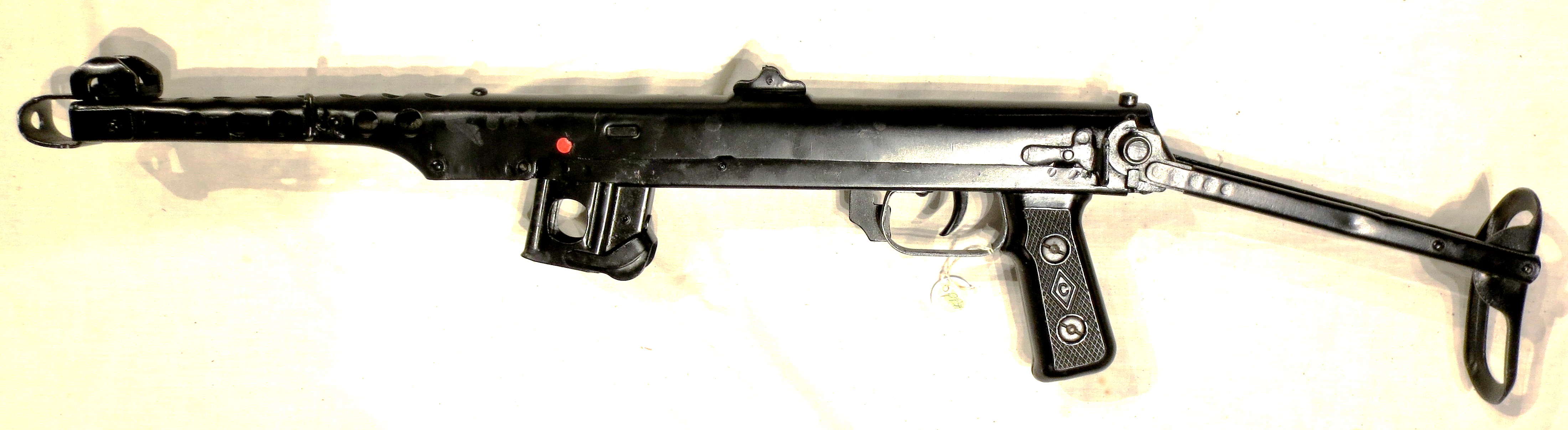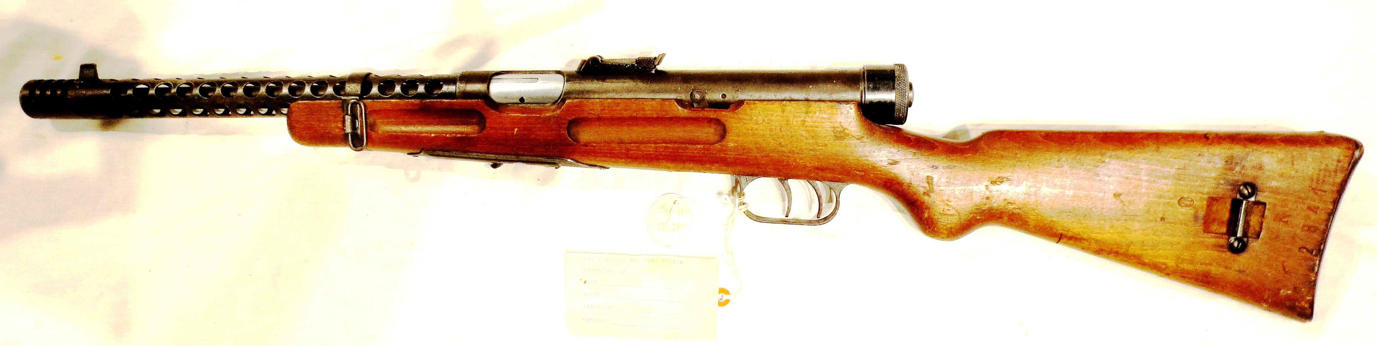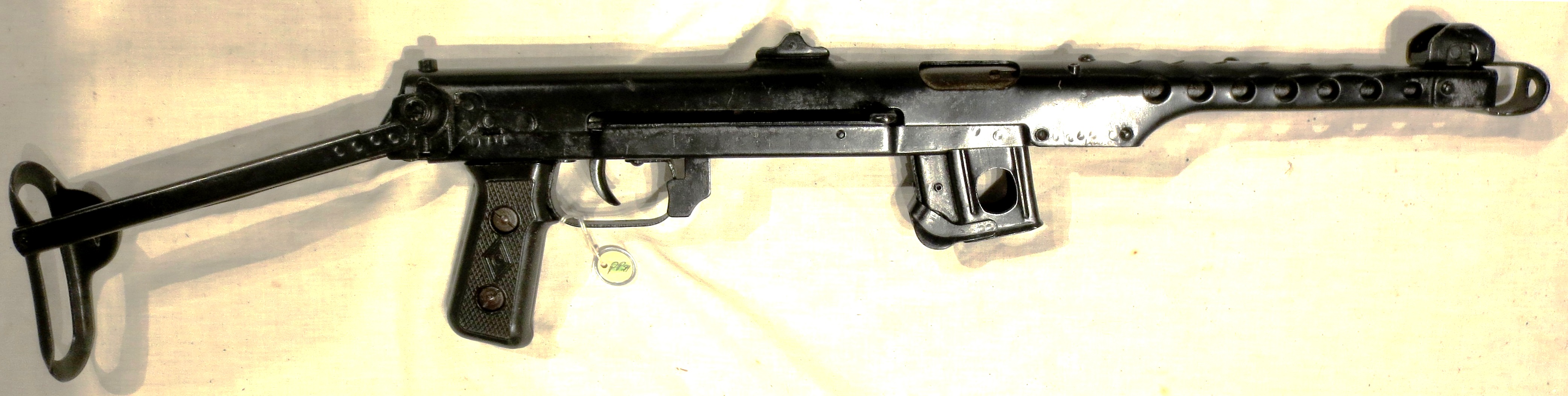The PPS has a trigger mechanism that allows only fully automatic fire and a manual safety that secured them against accidental discharges. When in the “safe” position (engaged by sliding a metal bar forward of the trigger guard), both the bolt and trigger are disabled.The weapon is fed from curved 35-round box magazines. They are not interchangeable with magazines used in the PPSh-41, nor can the gun use drum magazines. The PPS-43 magazine was significantly improved over the magazine from the PPSh-41, which contributed to greater reliability. The largest change being the transition to a “Double-Feed” design, so the double-stacked rounds are not bottle-necked into a single-stack at the feed lips. Like the PPSh-41, it is chambered for the 7.62×25mm Tokarev M1930 pistol cartridge.The submachine gun’s rifled barrel (with 4 right-hand grooves) is mounted in a perforated sheet metal heat guard and is equipped with a crude muzzle brake, consisting of a strip of steel bent into a U-shape that deflects exiting muzzle gases to the sides and backwards, thus compensating for recoil.A folding stock is attached to the receiver with a spring-loaded catch button on the top. The stock folds up and over the receiver top cover and the weapon can be fired in this arrangement. The submachine gun also has a pistol grip but was not provided with a forward grip as the magazine well was intended to fulfill this role. The PPS was usually supplied with two magazine pouches, an oil bottle, bore brush and sling.The PPS-43 was highly cost effective and easy to manufacture due to its efficient and simple, largely sheet metal design. Despite its crudeness, it has been described as controllable and reliable. (Wikipedia)