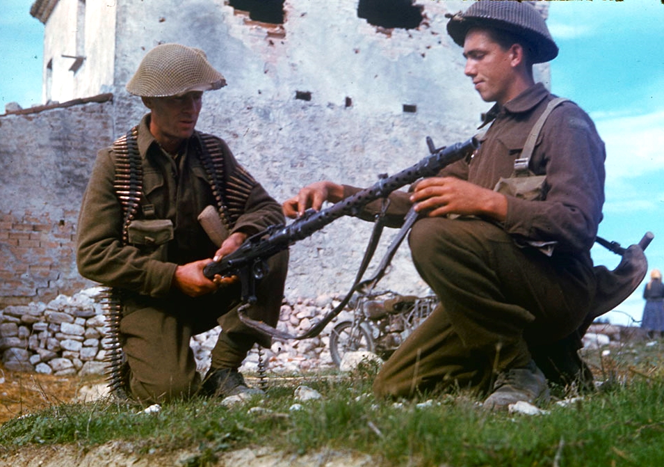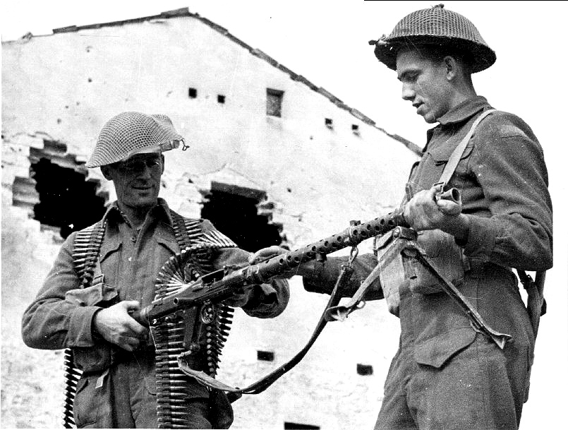 Canadian soldiers inspect a captured German MG34 machine gun.