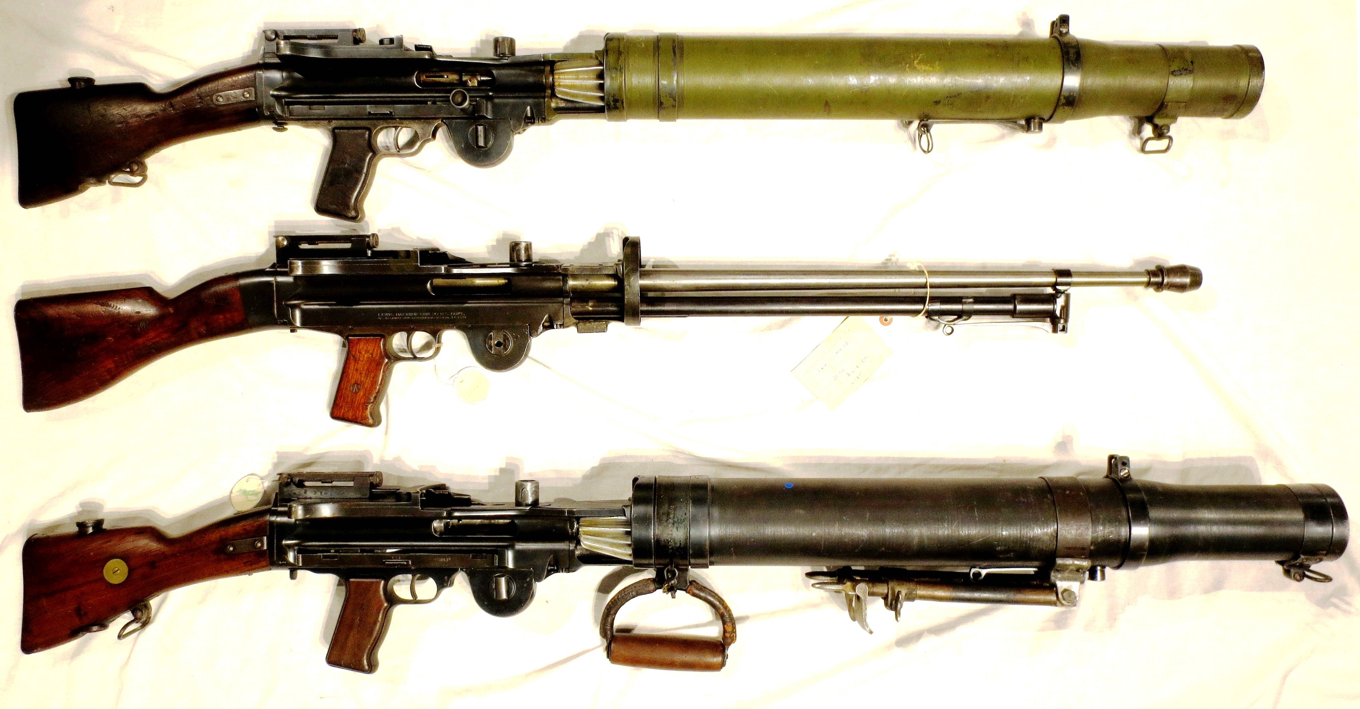 Lewis guns .303-inch (or Lewis automatic machine gun or Lewis automatic rifle).  The Lewis Gun is a First World War-era light machine gun of American design that was perfected and widely used by the British Empire.  It was first used in combat in the First World War, and continued in service with a number of armed forces through to the end of the Korean War.  It has a wide tubular cooling shroud around the barrel, often omitted in when used on aircraft, and a top-mounted drum-pan magazine.  It was commonly used as an aircraft machine gun, almost always with the cooling shroud removed, during both world wars.  The Lewis gun with the carrying handle is on loan to the NBMHM from the NBM in Saint John.