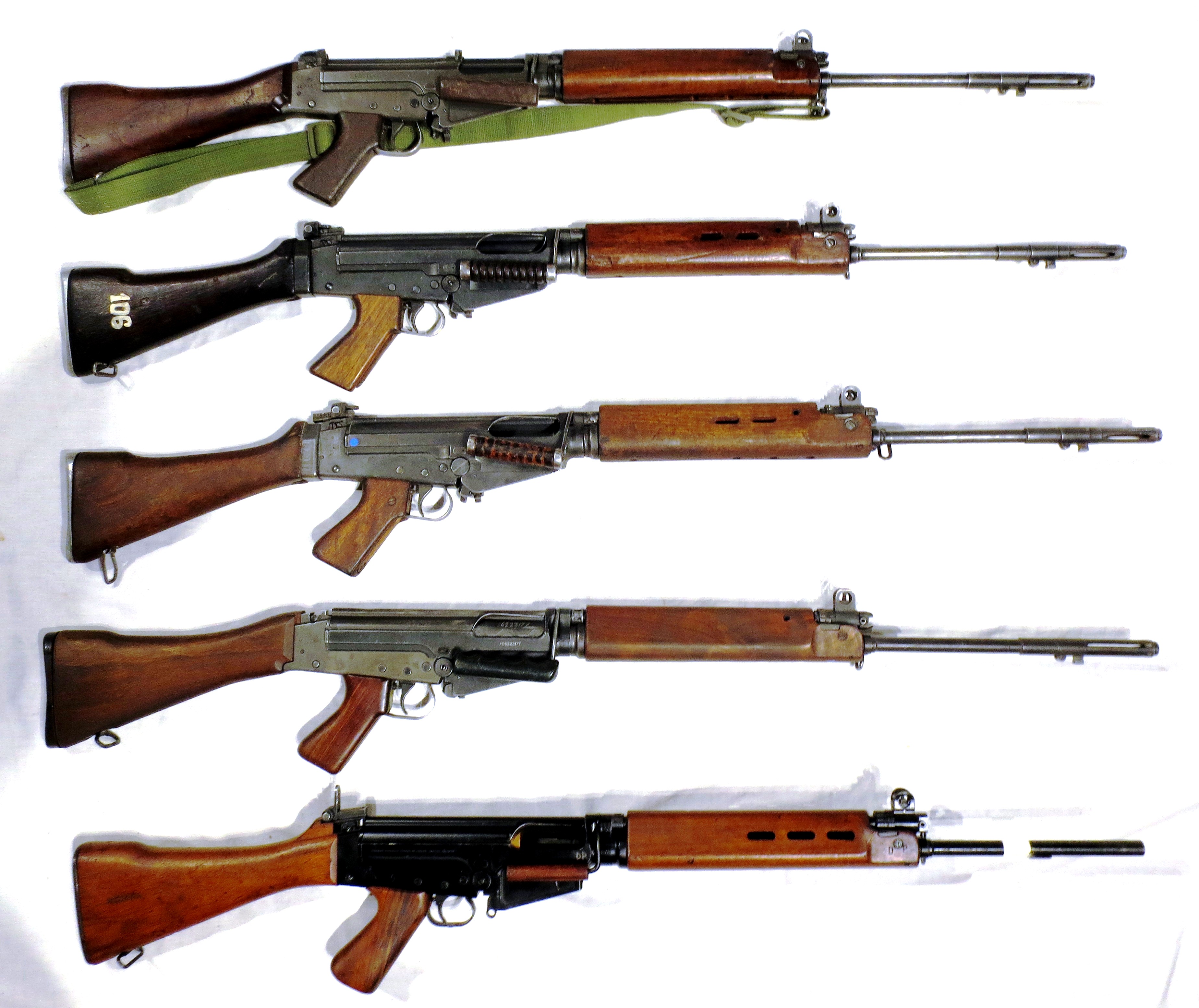 Canadian 7.62-mm FN C1 Rifles. Fabrique Nationale (FN) Herstal. It was the first semi-automatic rifle adopted by the Canadian Army and saw service from 1955 to 1985. Canada was also the first NATOcountry to use the rifle, which was later used by many militaries around the world. Replacing the Lee-0Enfield, the C1 was itself later replaced by the C7 and C8. Canada conducted experiments with the Belgian FN FAL. Canadian designers notably converted the metric design to imperial measurements. The Belgian design was also modified to Canadian specifications. Rather than only acquiring a few test models, Canada quickly ordered 2,000 rifles to conduct significant troop trials. In 1954, the rifle was adopted as the FN C1. The British and Australians also selected the FN FAL, based partly on successful Canadian experiments with the rifle. The FN C1 only had a semi-automatic fire mode. The FN C1 weighs 4.22 kg empty and is around 1.14 m long, with a barrel length of 53.4 cm. Chambered for 7.62×51 cartridges, the rifle uses a 20-round magazine. Unlike other FAL models, the magazine could be filled from the top using 5-round clips. A uniquely Canadian modification was the “Arctic trigger,” which allowed the standard trigger guard to be removed so the rifle could be fired while wearing heavy Arctic mittens. The C1 can be fitted with a bayonet and a grenade launcher. A blank-firing attachment (BFA) can be fitted to the end of the barrel to permit the firing blank ammunition on training exercises. The BFA serves two purposes: it prevents any unexpended blank material from escaping from the barrel (and possibly injuring someone) and forces gases back down the barrel to automatically recycle the next round to be fired. Canadian Arsenals Limited in Toronto produced 80,000 to 90,000 rifles under licence from FN. Of these, 72,470 were contracted to the Department of National Defence. The RCMP and the Ontario Provincial Police also used the C1 with slight modifications. The FN C1 remained the standard rifle of the Canadian Armed Forces from its first production in 1955 until its replacement in 1985. By far the rifle’s biggest user was the Canadian Army. (The Canadian Encyclopedia)