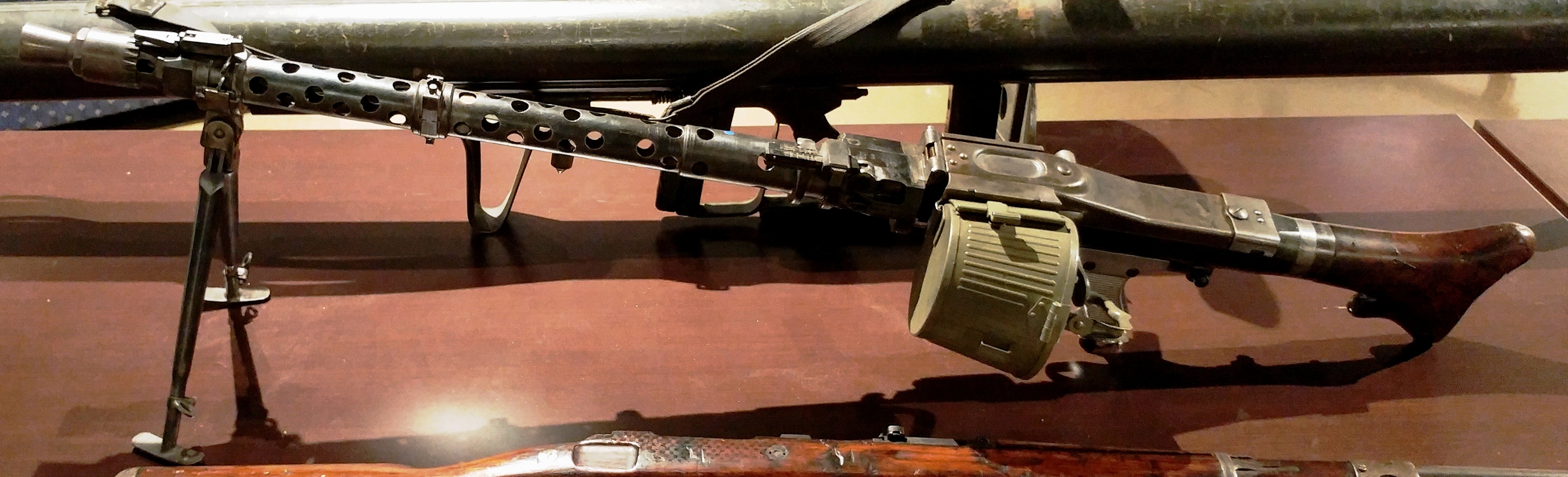 NBMHM Small arms collection, German Panzerschreck AT Rocket Launcher with blast shield, MG 34 machine gun, G98 Mauser bolt action rifle.