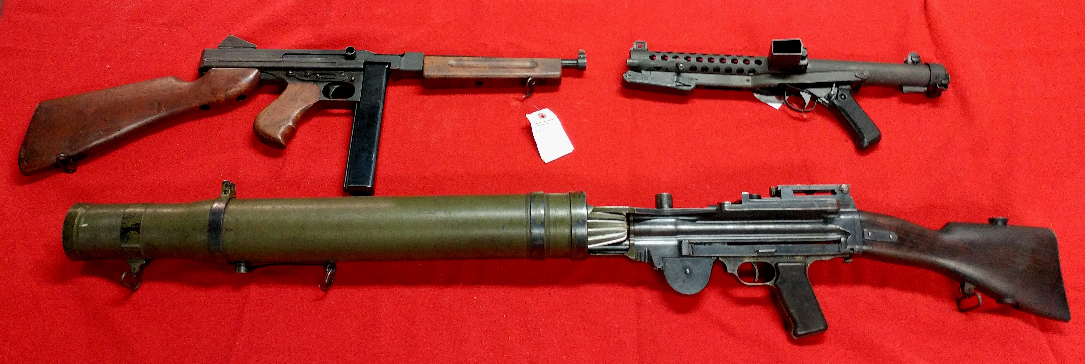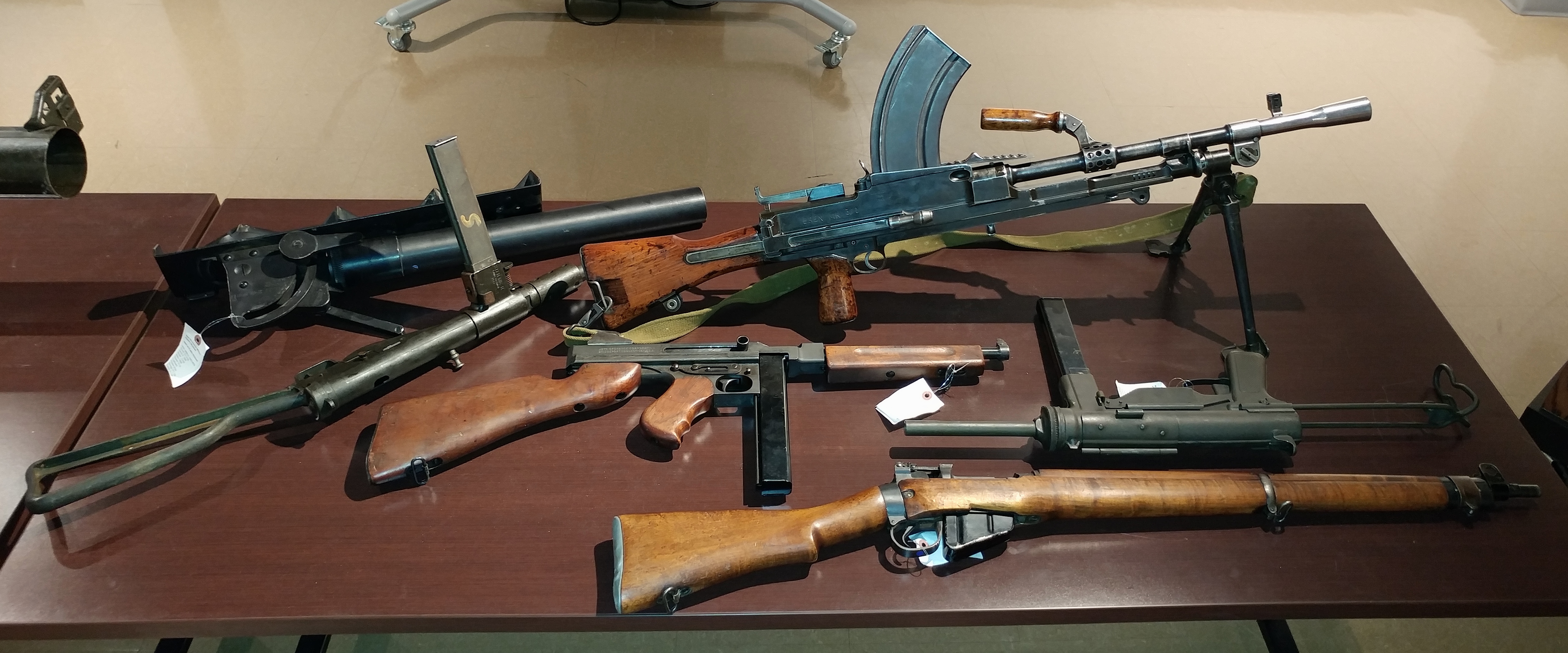 NBMHM Small arms collection, 2-inch Mortar, .303 Bren Gun, 9-mm Sten Gun, .45 cal Thompson SMG, .45 cal M3 SMG, .303 Lee  Enfield rifle.