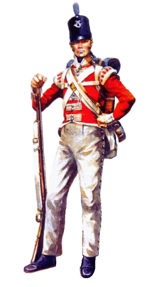 The majority of regiments consisted of one battalion of ten companies, in a few cases, two or more battalions of a regiment were formed. Of the ten companies in each battalion, one consisted of grenadiers and one of light infantry. Although grenades were not usually carried except for siege operations, the grenadier companies remained and were composed of the tallest and strongest men. The light infantry companies were introduced, largely upon the instigation of Sir William Howe, to provide each battalion with a body of picked marksmen to act as skirmishers. They carried a special kind of musket, which was lighter than that used by the other companies. During an engagement, the grenadier and light infantry companies were usually placed on the flanks of the battalions, and hence became known as the “flank companies”. Later, the practice of “brigading” the flank companies into special battalions was adopted. For example: Wolfe formed the Louisburg Grenadiers from the grenadier companies of the regiments left behind to garrison Louisburg when he sailed for Quebec. In 1812 a Flank Battalion under Colonel Robert Young of the 8th Foot was composed of the flank companies of several regiments. Many other illustrations of this sort might be given.