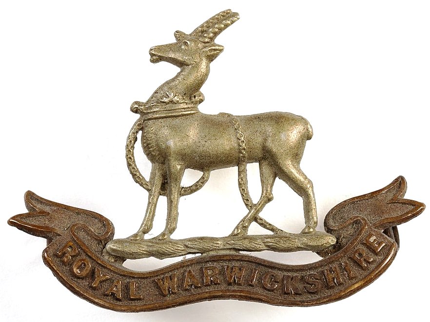 Badge, regimental. Royal Warwickshire Regiment Post 1898 cap badge of the regiment; an antelope, “ducally gorged and chained standing on a heraldic torse”, with a scroll inscribed Royal Warwickshire below. The Royal Warwickshire Fusiliers, previously titled the 6th Regiment of Foot and the Royal Warwickshire Regiment, was a line infantry regiment of the British Army
