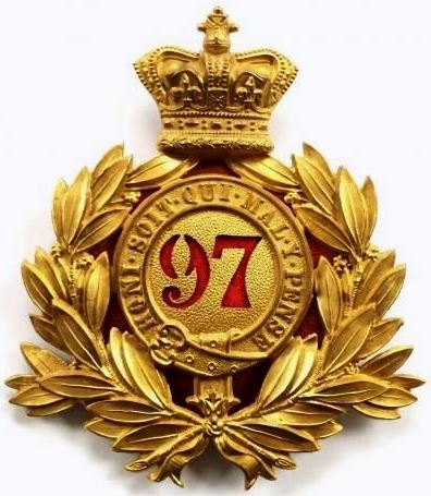97th Regiment of Foot was formed in 1798 as the Minorca Regiment, designated as the 97th (Queen’s Own Germans) in 1805. The regiment served in Bermuda, the West Indies, and America, including the expedition to Plattsburg in 1814. It was re-numbered as the 96th in 1816 and disbanded in 1818. Formed in 1824, the new 97th (The Earl of Ulster’s) Regiment of Foot went abroad in 1841, and served in Gibraltar, in the Ionian Islands, Jamaica, and in North America until 1853, when it came home. It was garrisoned in Fredericton from 1850 to 1851. In 1873 the 97th went to Jamaica, and served in that island, in the West Indies, Nova Scotia, and Bermuda, until 1880, when it was removed from Nova Scotia and sent to Gibraltar.