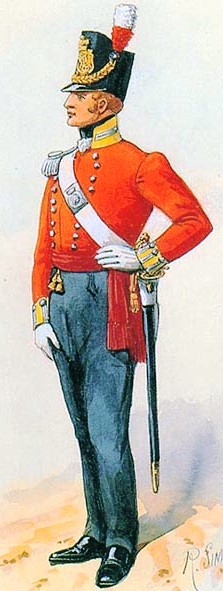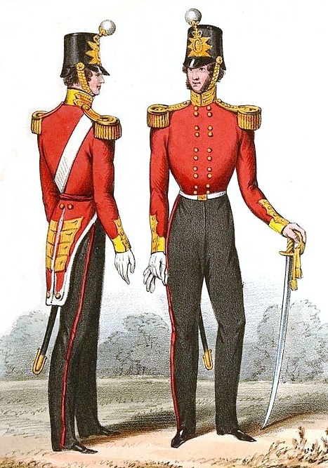 34th Officer c1815. The jacket was double-breasted and short-tailed, although the old long-tailed coat was used for full dress occasions. The bright yellow facings had silver buttons and lace loops. This man is a battalion company officer below field officer rank because he only has one silver epaulette. He also has a red and white plume on his shako to denote the battalion company. In full dress, white breeches were worn with Hessian boots but grey trousers were for foreign service wear.