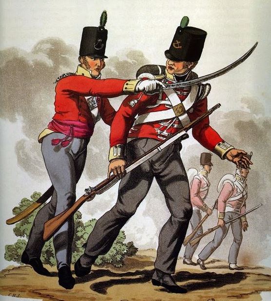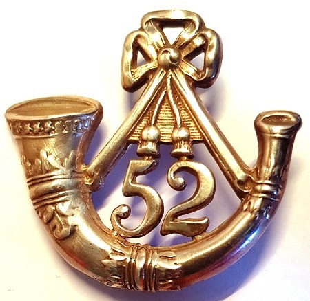 The Regimental Badge of the 52nd showed a bugle horn, suspended by cords from a knot, with the number “52” below the tassels. The bugle horn had been the badge of light infantry regiments since1770, adapted from the Hanoverian Jaeger regiments, and became standard for the newly formed Light Infantry regiments, since it represented the bugle calls used for skirmishing orders instead of the standard line infantry drum. The regimental badge was worn on much of the equipment, including the shakos and belts, and also frequently on turn backs and officers’ shoulder wings.