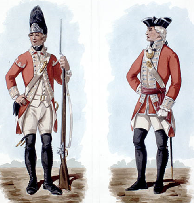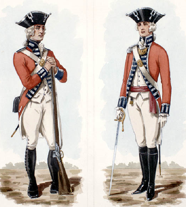 The uniform of a private soldier was ill adapted for comfort and speedy movement. In the majority of regiments in the 18th century it consisted of the familiar red coat – the voluminous folds of which were buttoned back to form lapels – stock, waistcoat, smallclothes, gaiters reaching just above the knee, and cocked hat. Ordinary regiments had facings each of a particular colour – yellow, green, buff, white, red, black, or orange, and for royal regiments, blue. Bandsmen were dressed in the colour of the regiment’s facings. Offïcers and men wore the hair clubbed, that is, plaited and then turned up and tied with tape or ribbon. In case the supply of hair on a man’s head was insufficient, he was obliged to eke it out with a switch. Over his left shoulder the foot soldier wore a broad belt supporting a cartouche box, while another belt around his waist supported a bayonet and short sword. On service the infantryman also carried a blanket, a haversack with provisions, a canteen, a fifth share of the general equipage belonging to his tent, and a knapsack containing extra clothing, brush, and blackball. These articles added to his accoutrements,arms, and sixty rounds of ammunition, made according to Burgoyne, “a bulk totally incompatible with combat and a weight of about sixty pounds”.