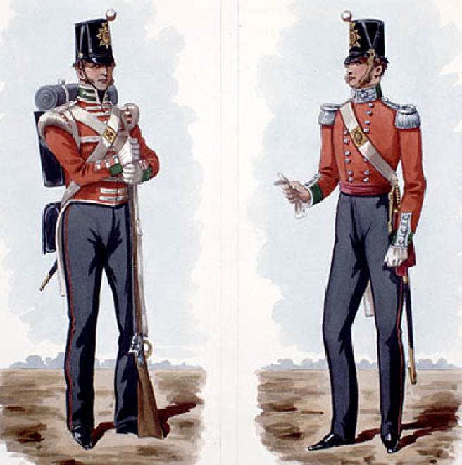 Officer and private of 52nd Regiment of Light Infantry, showing short jackets and stovepipe shakowith bugle badge and green plume, by C HHamilton & J C Stadler, 19th century.