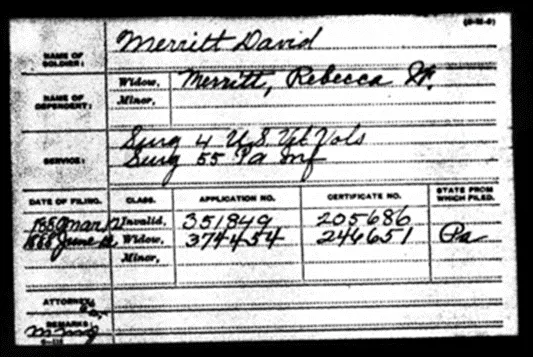 Returning to Philadelphia and hismedical practice he and his wife Rebecca went on to raise 2 children. A Son, David, born 29 September 1864 and a daughter Alma, 6 March 1871. They had lost 5children before this and it troubled Dr. Merritt deeply his entire life. Afterhis time in Union Service Dr. Merritt led a successful medical practice for thenext 20 years. All through his time in the army and after he continued to writeto his father telling him of his time in the service and of his success as adoctor. The fact that his father never acknowledged him after that last letterin 1852 troubled him greatly. He was a son looking to repair the brokenrelationship and for acknowledgement that he was a worthy son. But no letterever came before his father’s death in 1884. Dr. Merritt suffered with recuring bouts of malaria for the rest of hislife. Dr. Merritt finally applying for a pensionfor his military service which was granted in 1880. He took ill in 1884 and pasted away on 27 May1888 and was buried in Glenwood Cemetery Philadelphia Pennsylvania. Perhaps indeath he was able to reunite with his father and repair what had been lost.