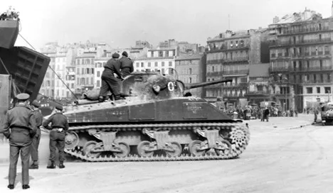 Canadian Sherman V tanks, likely with the 5thArmoured Brigade, 2nd Armoured Regiment (Lord Strathcona’s Horse (Royal Canadians), 5th Armoured Regiment (8th Princess Louise’s (New Brunswick)Hussars) or the 9th Armoured Regiment (British Columbia Dragoons), moving out of an LST on arrival in Marseilles, France, 6 March 1945. This was part of Operation Goldflake, which involved the move of 1st Canadian Corps from Italy to North-West Europe, February-March 1945.
