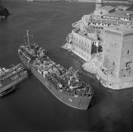LST 173carrying a cargo of vehicles and supplies entering Marseille harbour during Operation Goldflake, spring 1945. This operation involved the move of the entire 1 Canadian Corps and the 1st Canadian Armoured Brigade from Italy to Northwest Europe, where they were to join the 1st Canadian Army who had been in combat since 6 June 1944.