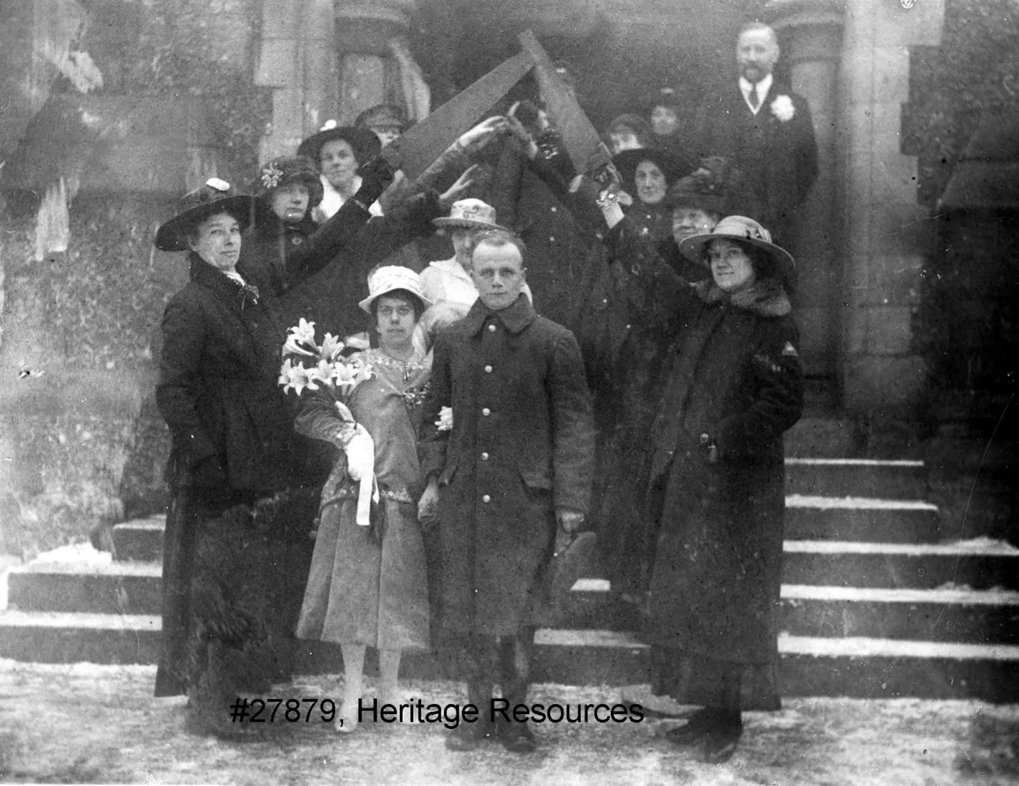 The badge and the wedding photos are the focus of this collection though. The photos are of the wedding party inside the Church. The one photo outside shows two files of ladies behind the bride and groom, with the two ladies at the forefront holding crossed hand-saws. There is an unidentified man standing at the top of the stairs.