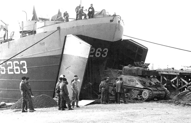 Operation Goldflake, 1st Canadian Corps with Sherman tanks of the 8thNew Brunswick Hussars being loaded on Landing Ship Tank (LST) S263.