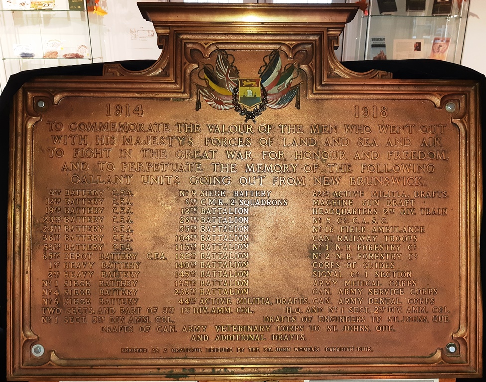 1914-1918. To commemorate the valour of the men who went out with his majesty’s forces of land and sea and air to fight in the great war for honour and freedom, and to perpetuate the memory of the following gallant units going out from New Brunswick.