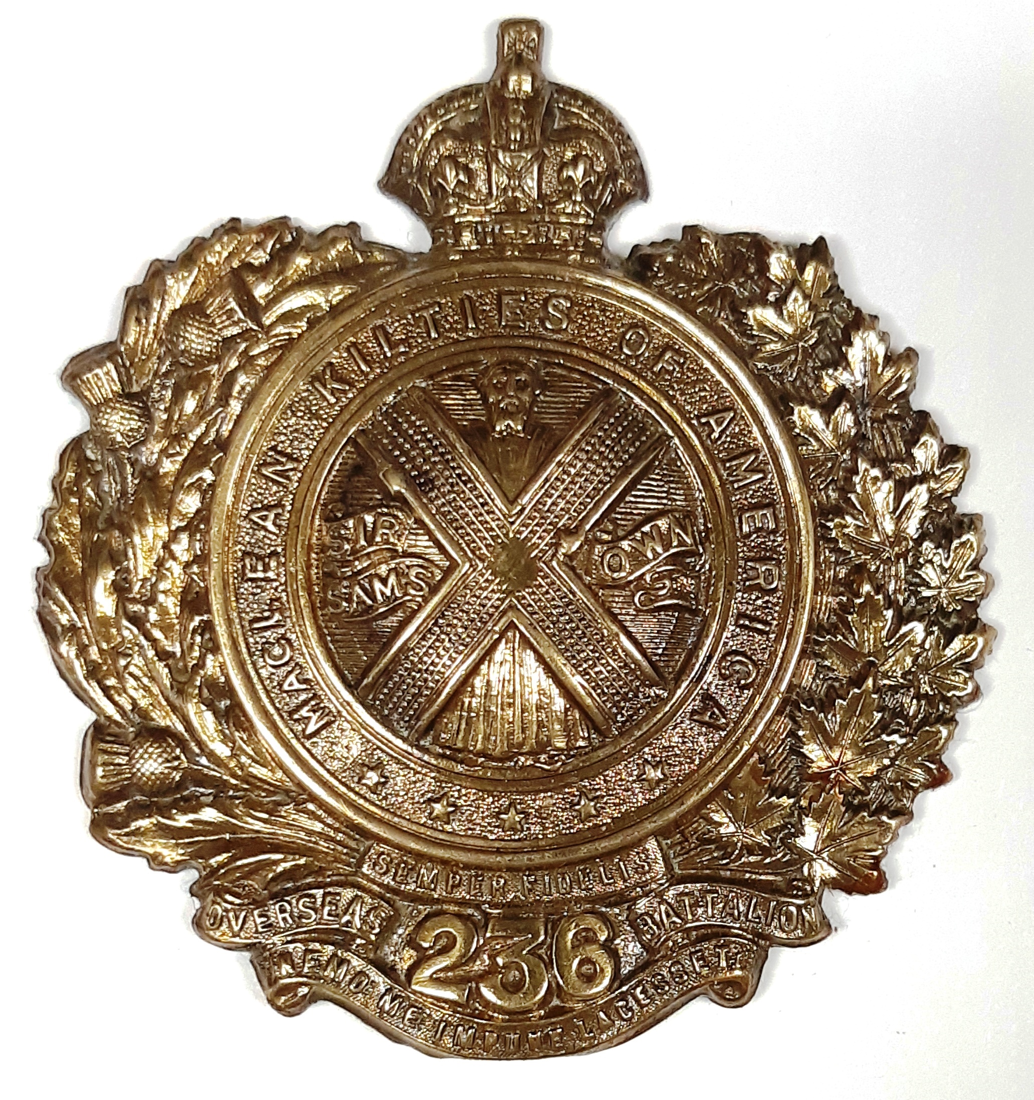 In honour of the American volunteers a new Balmoral badge was introduced with the motto ‘MacLean Kilties of America ‘ replacing the former ‘The New Brunswick Kilties’. The 236th Battalion sailed for England on 17 November 1917 with a strength of 27 officers and 1029 other ranks under command of Lieutenant-Colonel P.A. Guthrie (71st York Regiment), this number included the 247th Battalion raised in the counties of Victoria and Haliburton, Ontario, Sir Sam Hughes’s own political riding in which recruiting had dried up completely. In February 1917 the 236th was tentatively assigned to the 5th Canadian Division but was withdrawn in May 1917 and absorbed into the 20th Reserve Battalion, this the reinforcing battalion for the 13th and 42nd (Black Watch) Battalions serving in the field with the Canadian Corps in France and Flanders. The pipes and drums of the 236thamalgamated with other pipe bands to form the pipe and drums of the 20th Reserve Battalion. The 236th Canadian Infantry Battalion was disbanded under General Order 149 of 15 September 1920.
