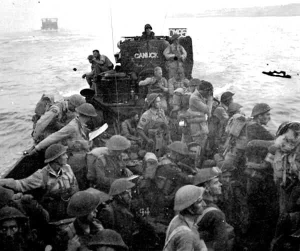 Soldiers of the 3rd Canadian Infantry Brigade cross the Strait of Messina and approach the shores of the Italian mainland, 3 September, 1943. / Des soldats de la 3e Brigade d’infanterie canadienne traversent le détroit de Messine et s’approchent des côtes du continent italien, 3 septembre 1943. (DND Photo)
