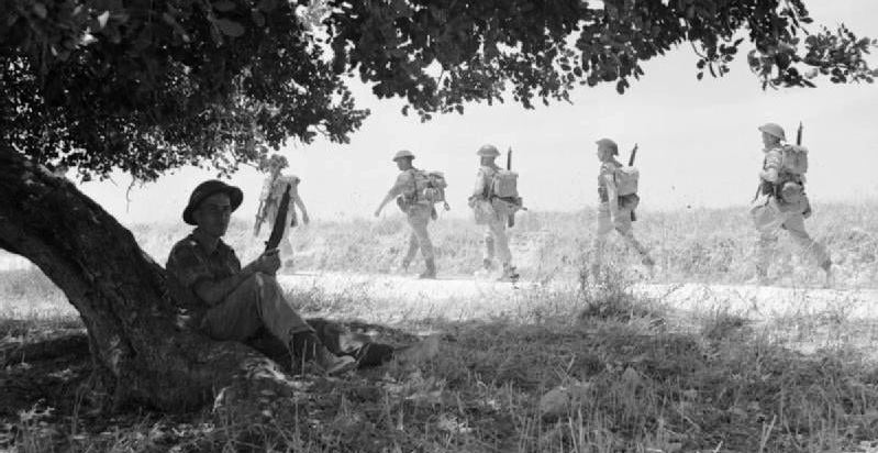 Soldiers of the Carleton & York Regiment move inland near Pachino, Sicily, 10 July 1943. / Des soldats du Carleton & York Regiment se rendent dans les terres près de Pachino, en Sicile, le 10 juillet 1943.