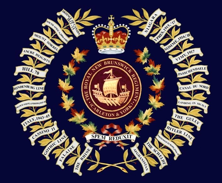 The Regimental colours with the Battle Honours of the Royal New Brunswick Regiment (RNBR).