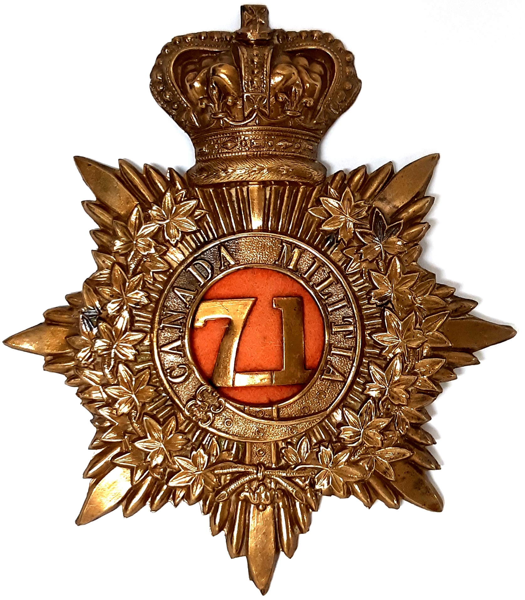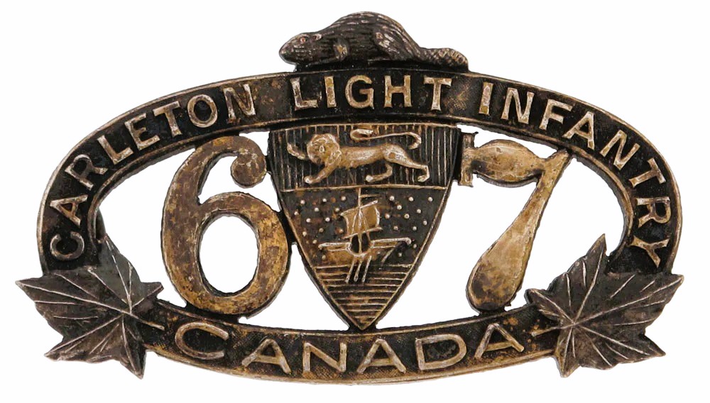 With the 1903 introduction of the ‘Naval’ or ‘staff’ pattern forage cap throughout the Canadian Militia many individual Militia regiments found themselves in need of an appropriate badge to decorate this new style of cap.  Some regiments had previously worn a badge on the Glengarry and simply adopted these as an interim measure. Other regiments, however, had either worn numerals or nothing on their Glengarries. Shortly after the February 1904, General Order (GO 18) approved the ‘Naval’ pattern forage cap for the use the 67th “Carleton Light Infantry”, their Commanding Officer felt that the new forage cap was an opportunity to acquire a new, distinctive, badge. (MilArt)