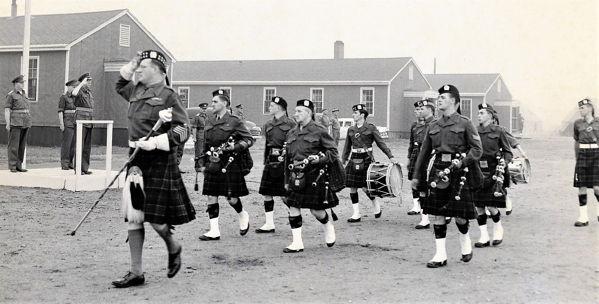 Drum Major JF “Lofty” MacMillan leads the New Brunswick Scottish Pipes & Drums, Camp Utopia, NB, circa 1954.